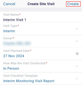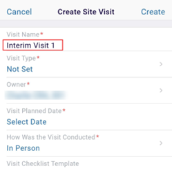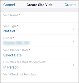 - On the Create Site Visit screen, add the following mandatory details marked with a