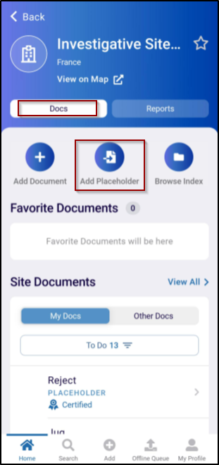 - On the Docs tab on a particular site, click on the Add Placeholder button.