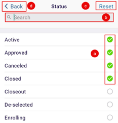 - Select the required status options by clicking on the radio button. A green checkmark is displayed to show the currently selected statuses.
