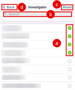 - Select the required investigators by clicking on the radio button. A green checkmark is displayed to show the currently selected investigators.