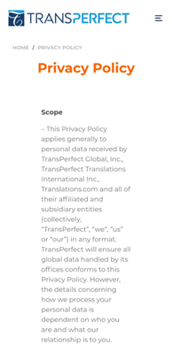 - The Privacy Policy page displays details regarding how an organization handles customers