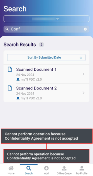 To ensure secured access to the document, the Search screen displays a notification when users attempt to open a Confidentiality Agreement document via the Cross Room search.