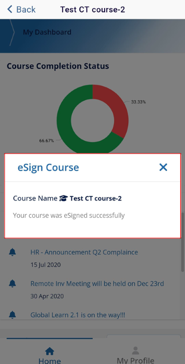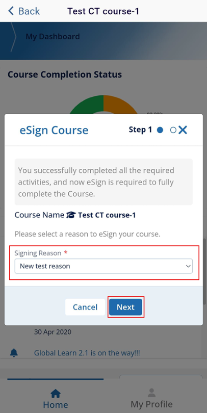 - On the eSign Course popup, mandatorily add a signing reason by accessing the dropdown