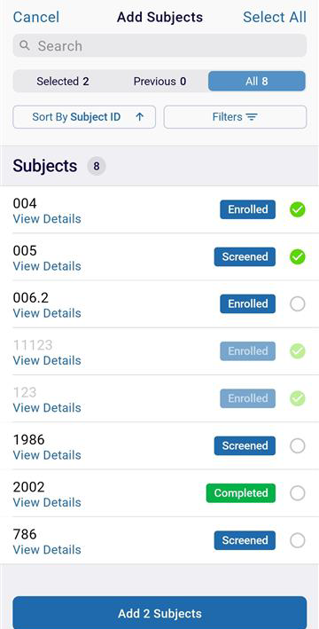To sort and filter the Visit Subjects list follow the standard procedure detailed in the Customize Site Visit screen section.