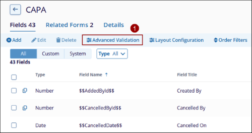 - On the Fields tab, select Advanced Validation from the top menu bar.