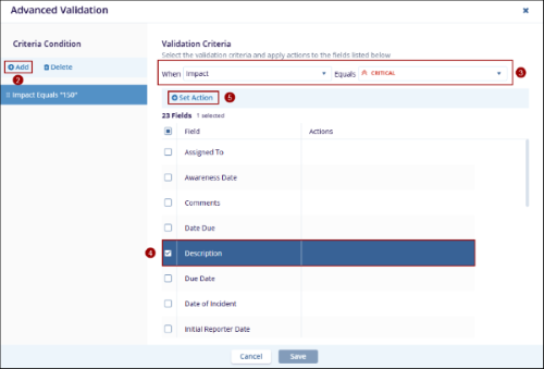 - This means that when a user creates a record, i.e., Incident, CAPA, or Action Item, etc., where this validation is applied and selects Critical as the Impact, they must provide a value in the Description field before proceeding, i.e., the Description field becomes mandatory.