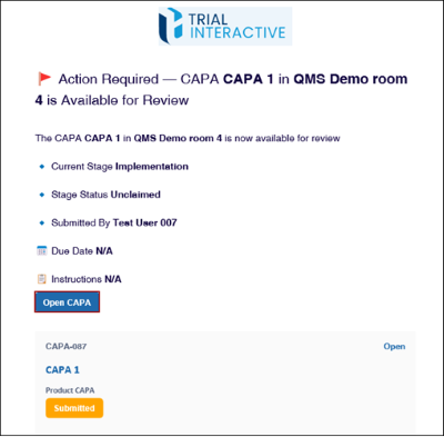 click on the Open CAPA button from the email notification.