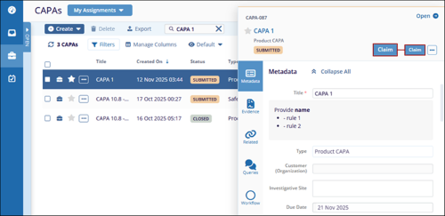 - On the CAPA records screen, click on the Claim button.