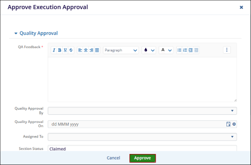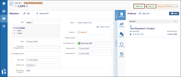 When a CAPA record enters the approval workflow, the designated authorities are responsible for advancing the record through each stage until it reaches the final stage. At the final stage, a user (typically an Approver) reviews and approves the record, thereby resolving it.