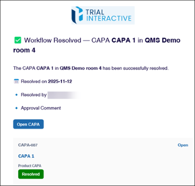 - As the assigned authority in the last stage, access the CAPA record through the email