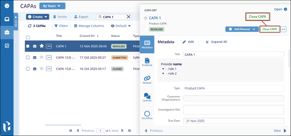 - On the CAPA records page, click on the Close CAPA button above the Quick View