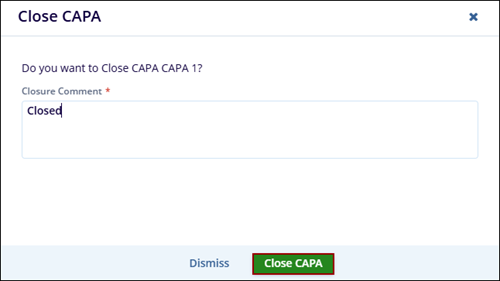 - On the Close CAP’ popup, mandatorily add a comment and click on the Close CAPA button.