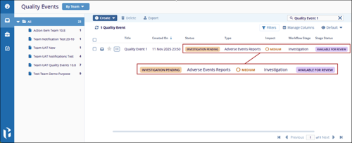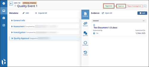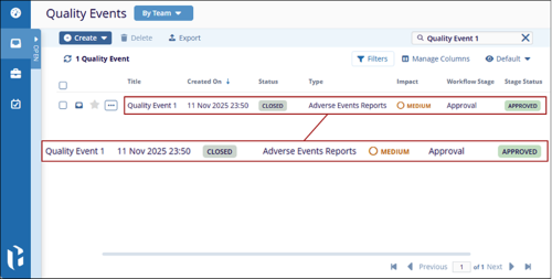 When a Quality Event record enters the approval workflow, the designated authorities are responsible for advancing the record through each stage until it reaches the final stage. At the final stage, a user (typically an Approver) reviews, approves, and closes the record.