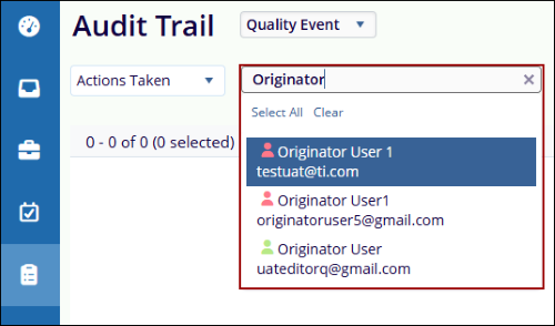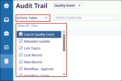 dropdown menu for filtering the audit trail as per the selected parameter. The Actions Taken