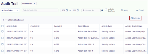 Refresh: The Refresh button is visible and accessible when the audit trail results