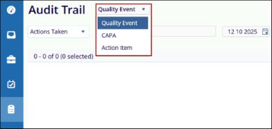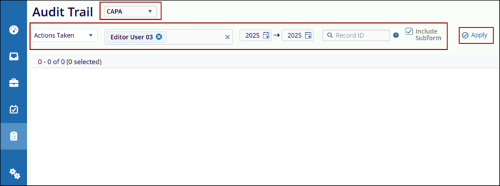 Users can retrieve the audit trail based on selected parameters. The options in the Actions Taken dropdown are displayed according to the chosen parameter.