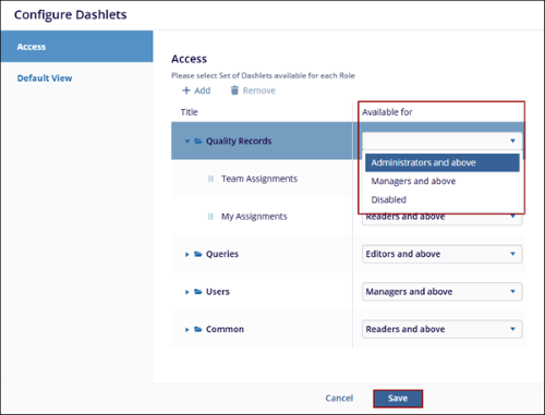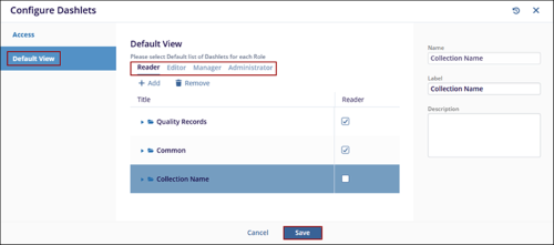 - Switch to the Default View tab, and select the required and appropriate checkboxesfor the roles mentioned – Reader, Editor, Manager, and Administrator.