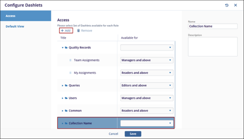 dashlets (displayed as the collection name). Enter the Name and Description in the fields on