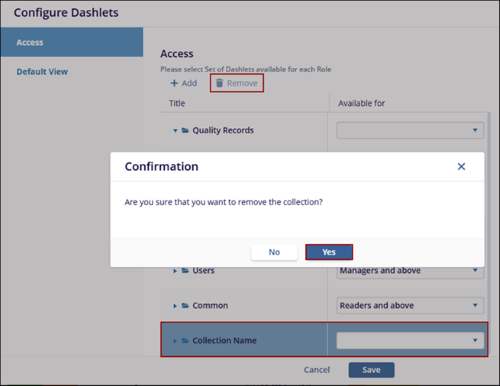- Click the Remove button to delete the collection. A confirmation message appears stating, “Are you sure you want to remove the collection?”