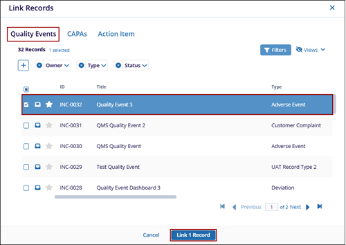 - In the Link Records window, select the Quality Events, CAPAs, or Action Items tab.