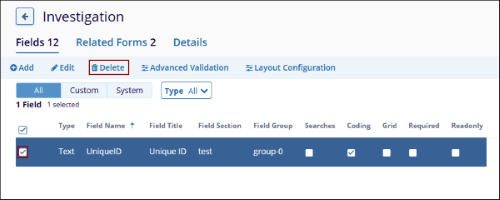 - Select a field to delete from the Fields tab and click on the Delete button.