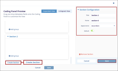 - To create an additional section in the form, click on the Create Section button within the Coding Panel Preview.