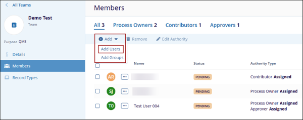 The Members page displays a list of users linked to the team, along with options to Add, Remove, or Edit their authority roles. It also includes tabs showing the count of users in each team and provides a Search function for easy user lookup.