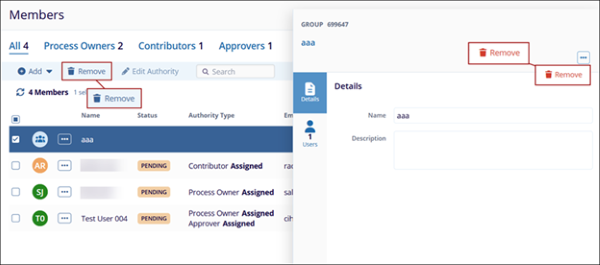 Select the checkboxes next to the Users/Groups that need to be removed from the Members page grid view.