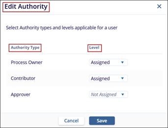 - The Edit Authority pop-up window is displayed with the Authority Types and Level