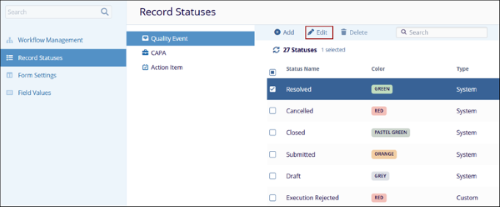 The Record Statuses tab allows Admin users to manage a list of statuses used in QMS workflows by adding, editing, or deleting the record statuses as needed. After configuring the record statuses in this section, the Record Status dropdown in the Workflow Creation wizard will display the available options.