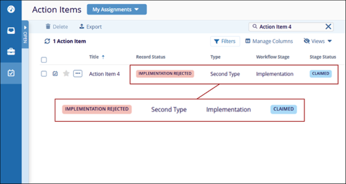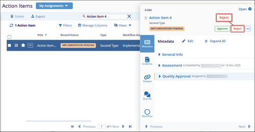 Authorities within the workflow stages can reject an Action Item record based on the stage-specific configuration. Rejections typically occur during the Approval stage by the designated Approver. When an Action Item is rejected, it is sent back to the previous stage. For instance, if a record is rejected at the Implementation Approval stage, it will return to the Implementation stage.