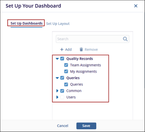 - The Set Up Your Dashboard window appears. By default, the Set-Up Dashboard option is displayed. Expand the fields using the arrow and select the required checkbox.