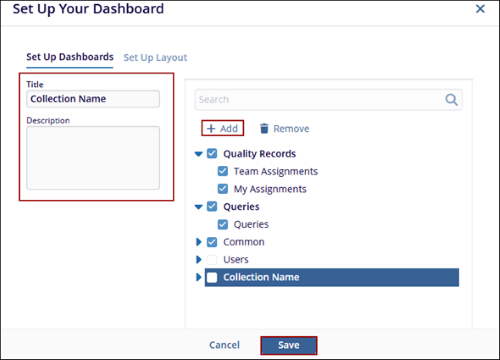 - Click on the Add button, and a new entry will appear under the list of available dashlet as (collection Name).