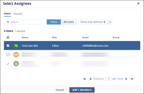 - The Select Users pop-up window displays two tabs: Team Members and All Users. By