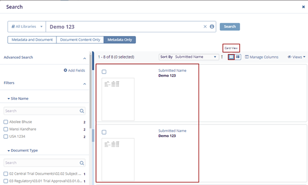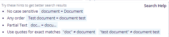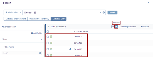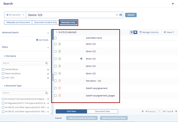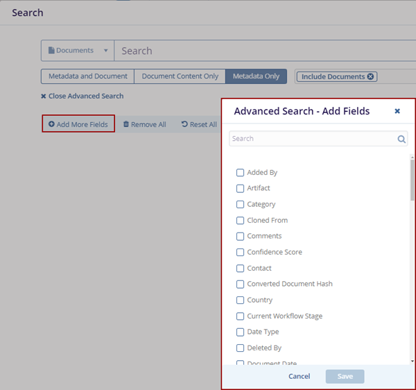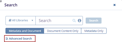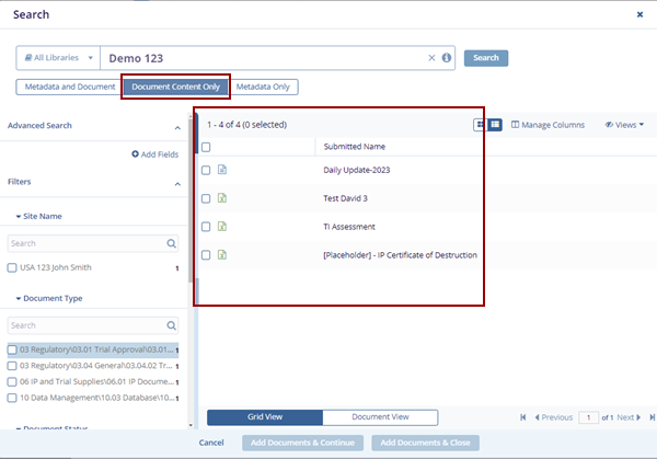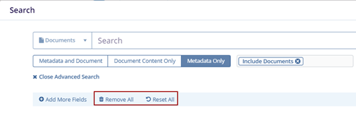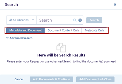 Note: The Metadata and Document tab is pre-selected by default. Choose Document Content Only or Metadata Only if you want to filter the results accordingly.