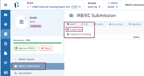 - Click the IRB/EC Submission option on the IRB/EC Details page. This opens the IRB/EC Submission Page.