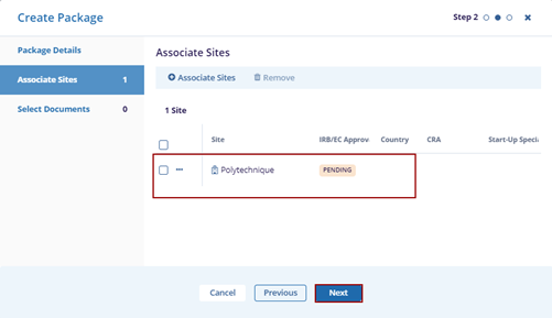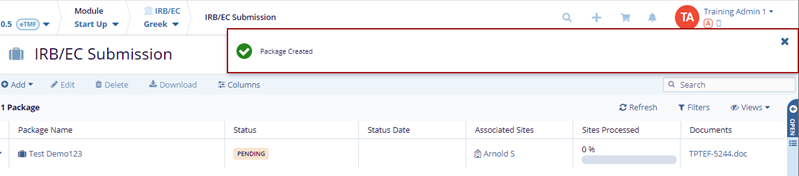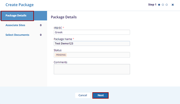 - In the Package Details tab, fill in the required fields – IRB/EC and Package Name.