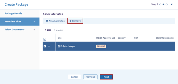 The associated site is removed from the Create Package.