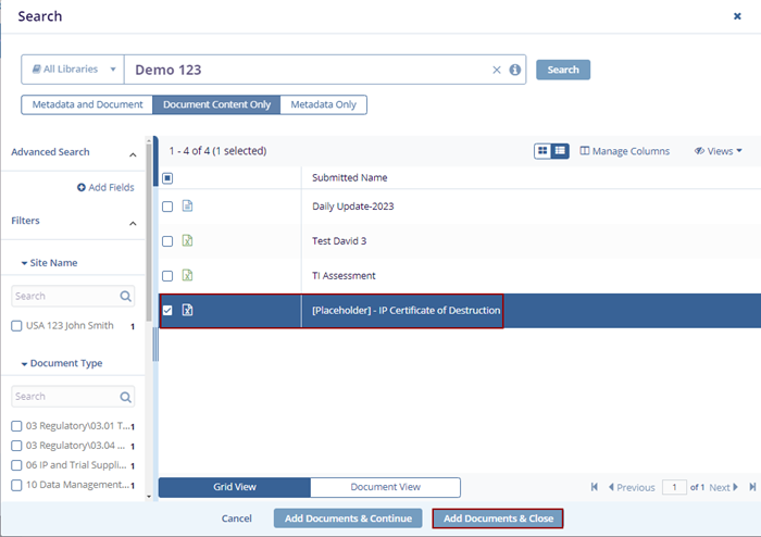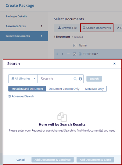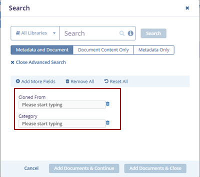 - Clicking Add Documents & Close will close the Search pop-up window.
