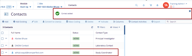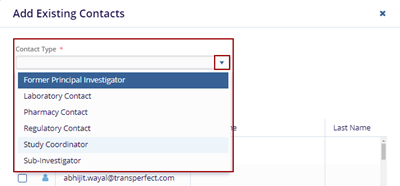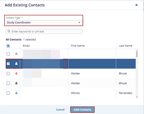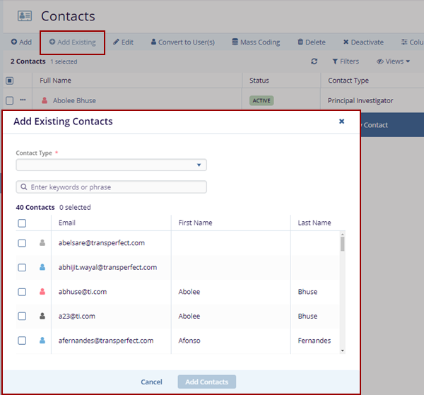 - Select the User’s Email ID from the list within the Add Existing Contacts pop-up