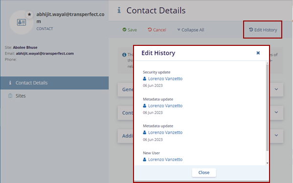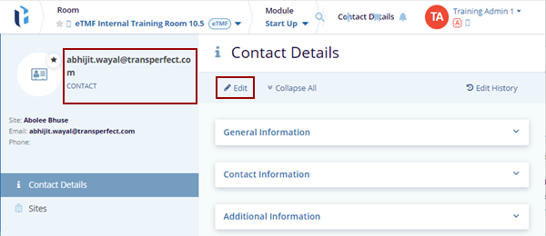 - Click on the name of the newly created contact the Contact Details page is displayed with the existing information.
