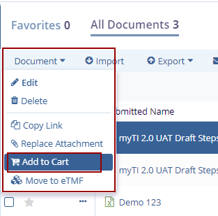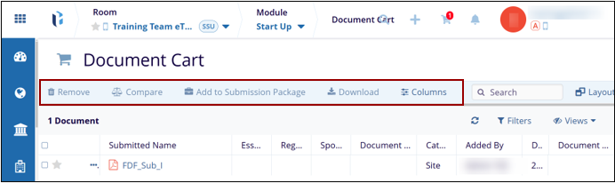 Users can add a document selected from the grid to the cart to compare documents, link them, add them to the submission package, or download documents.