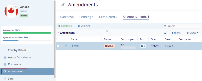 Once a clinical trial begins, protocol amendments often require sites to submit additional essential documents. These documents can only be specified through Amendments, which can be created for Investigative Sites, Country Amendments, and IRB/EC.