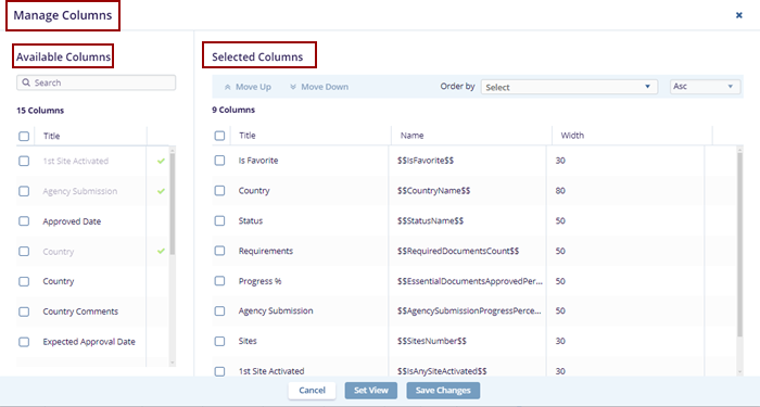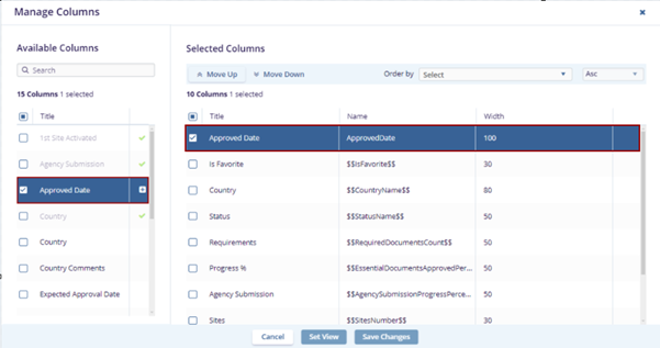 - On the Manage Columns window, the "Available Columns" section