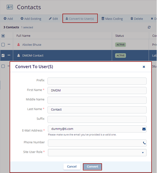 - The Convert to User(s) pop-up window is displayed with the Cancel and Convert buttons.