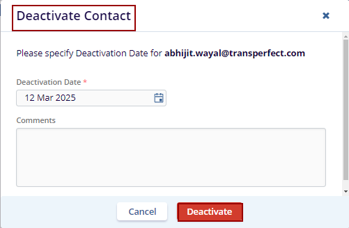 - The Deactivate Contact pop-up window is displayed with Cancel and Deactivate buttons.