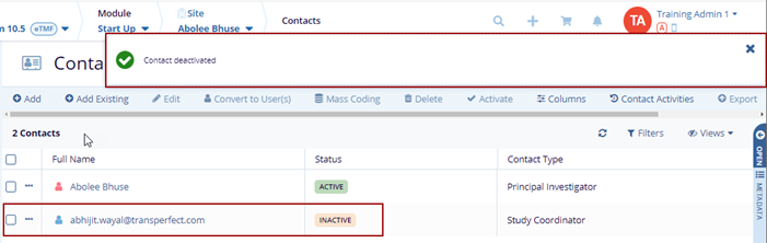 - The selected contact gets deactivated and the notification message is displayed on