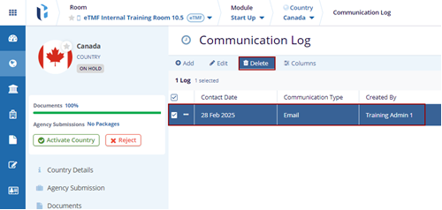 1. Select the checkbox of the log to delete. This enables the Delete button to be displayed on the top menu bar.