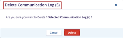 2. Click the Delete button. The Delete Communication Log (s) dialog box is displayed with the Cancel and Delete buttons.