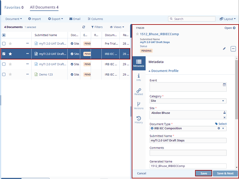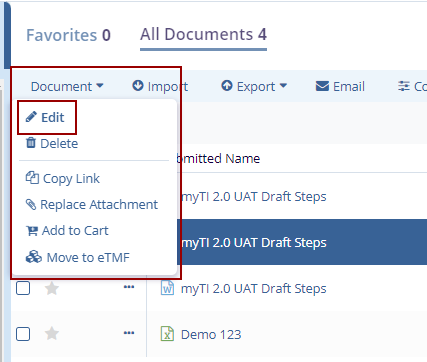 - Select the checkbox of the document to be edited.